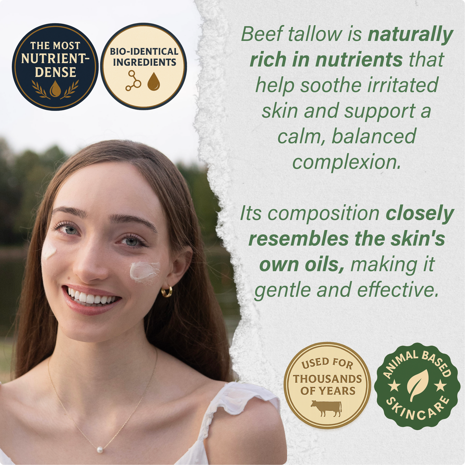 Tallow is valued for its anti-inflammatory properties, which can help soothe redness and irritation. By supporting balanced oil production, it can help the skin feel calmer and more even-toned.