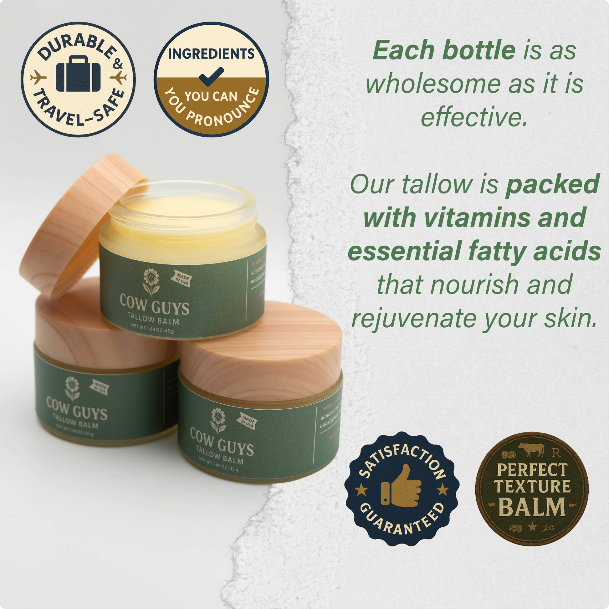 Anti-inflammatory Properties: Beef tallow is naturally rich in nutrients that help soothe irritated skin and support a calm, balanced complexion. Its composition closely resembles the skin's own oils, making it gentle and effective for reducing redness and discomfort without synthetic additives.
